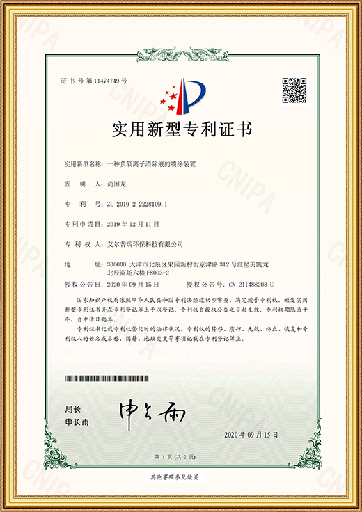 實用新型專利證書(一種負(fù)氧離子清除液的噴涂